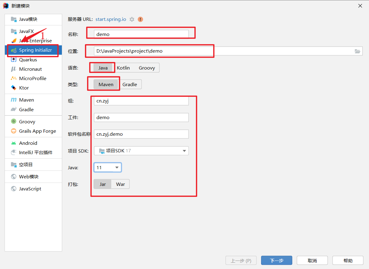 - 创建新模块,选择Spring初始化,并配置模块的相关基础信息,点击下一步