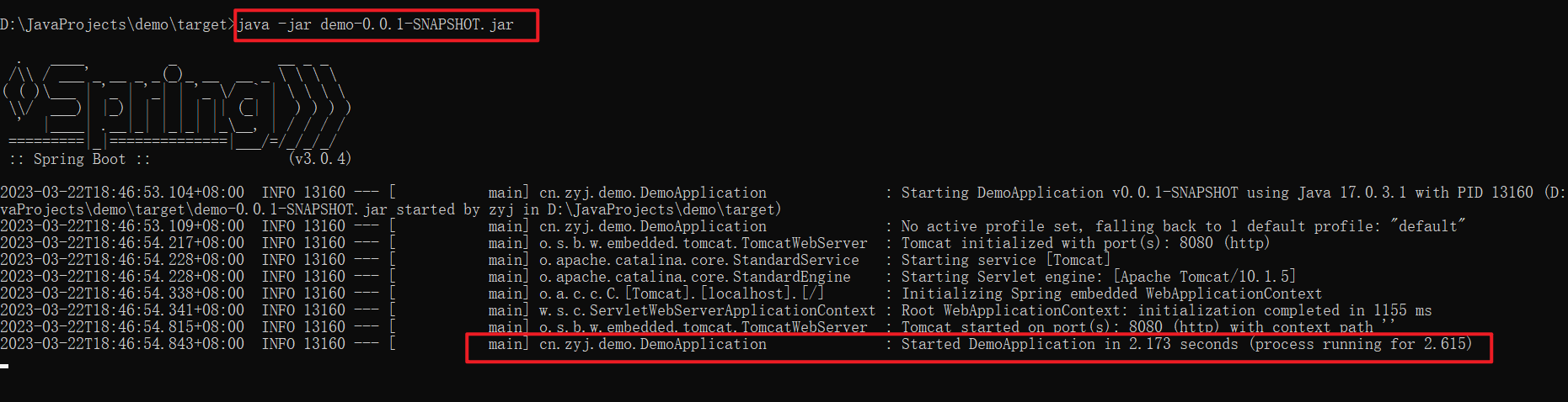 - 运行打包完成的项目,在jar包目录下使用命令窗口执行 java -jar +jar包名