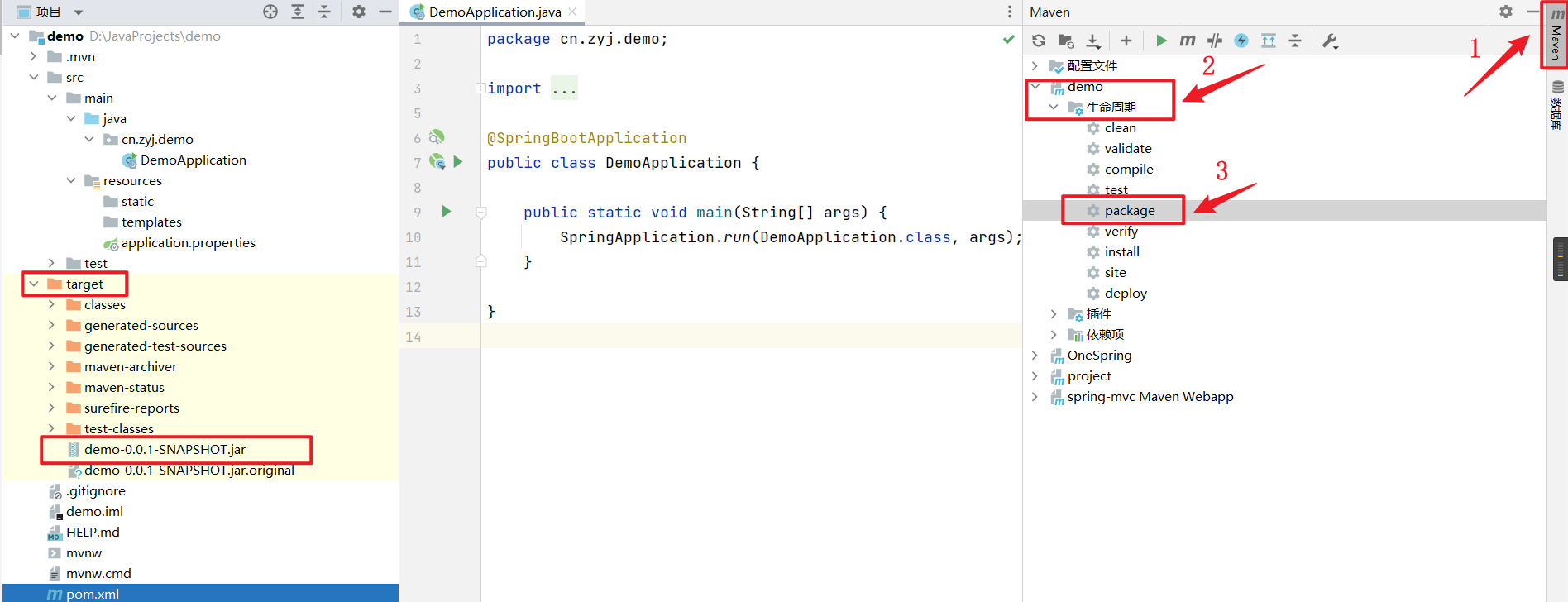 </build>- 使用 maven 的 package 命令打包,完成后会在 target 目录下生成 jar 包