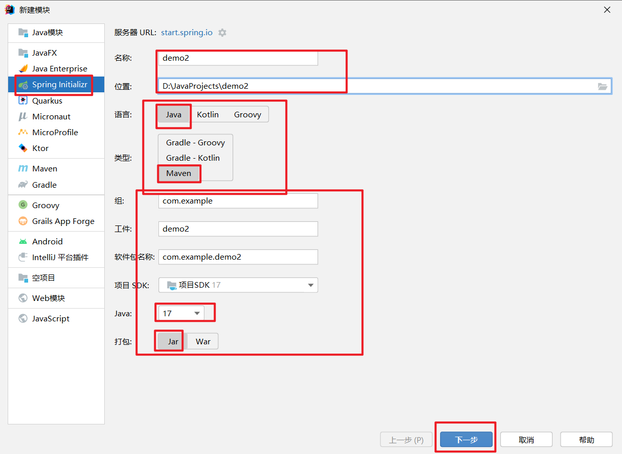 - 创建模块,勾选 Spring Initializr 并配置相关基础信息