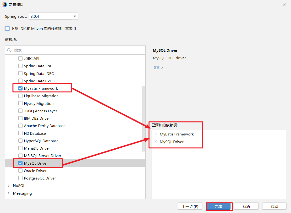 - 选择当前模块所需要的技术集(MyBatis、MySQL)